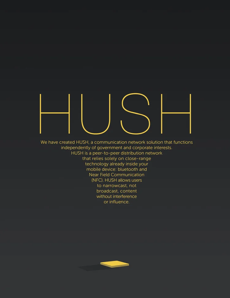 Concept: HUSH: a decentralized, peer-to-peer communication network, which doesn't use any system overseen by government or corporate entities. Content is spread — in the most literal sense of the word — virally.